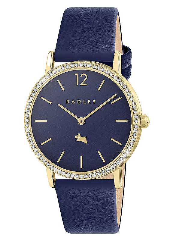 Radley London Mill Bay Iconic Ink Leather Strap. Iconic, the Mill Bay features a 35mm stone set polished gold case. Designed to dazzle, the rich ink satin dial creates a bold and captivating look. The watch is finished with a soft Ink genuine leather strap and traditional polished gold buckle. Presented in a beautiful Radley London giftbox, with 2 year guarantee.Leather