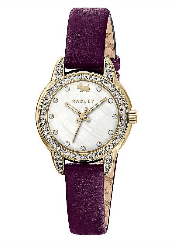 Radley Gold Plated Stone Set Mother of Pearl Deep Purple Leather Strap Watch. Featuring a petite 26mm gold plated case and stone set bezel and shoulders. The delicate white mother of pearl dial is highlighted with gold detailing and is finished with a deep purple genuine leather strap. Presented in a Radley London giftbox, with a 2 year guarantee.Brand: Radley LondonWhite Mother of Pearl Dial26mm Gold Plated Petite CaseGenuine Leather