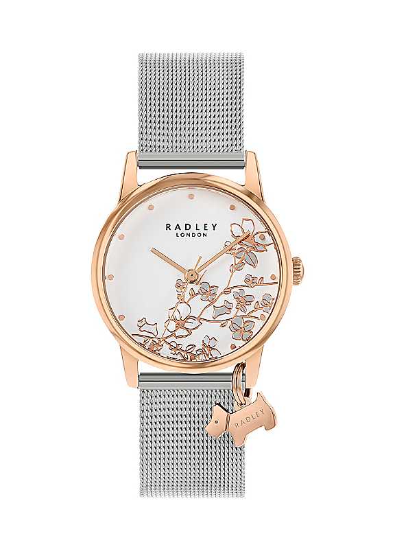 A stylish Radley watch with a rose gold tone 30mm case and a white face with a trailing flower design for added interest. Fitted with a stainless steel mesh bracelet and with an iconic Radley charm hanging from the case. 30 metres water resistancy will protect the watch and allow it to be worn in scenarios where it is likely to be splashed but not immersed in water. It can be worn while washing your hands and will be fine in rain. The watch is supplied in a branded box and a 12 month guarantee from the manufacturer. Brand: Radley London Case material: Brass Lens material: Mineral glass Dial colour: White Strap type: Mesh Fastening: Square slider Movement: Japanese analogue Water resistance: 30 metres Case diameter: 30mm Manufacturers guarantee: 1 year | ladies analog watch, round dial watches, mesh strap watches, casual watches ladies, mineral glass watch, floral watch women, rose gold watch, brass watch, ladies watch bracelet, water resistant watch, stainless steel watch