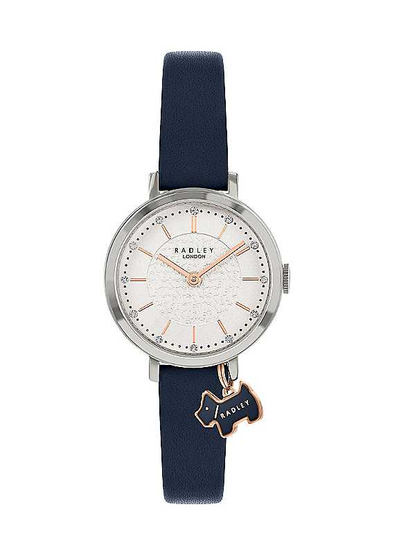 Radley London Ladies Etched Dial Silver Ink Strap Watch. Features an Etched 'Radley London' Dial, Stone set five minute Markers, Silver Case, Genuine Leather Ink Strap & a Radley Dog Charm. Includes Radley London gift box and 2 year guarantee.Ink leather strapCase textureMinute markers, SilverLeather | ladies analog watch, round dial watch, silver watches womens, ladies casual watch, leather strap watch, navy blue watch
