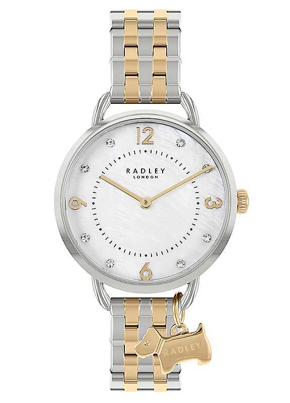 Radley London Southwark Park Ladies two tone bracelet watch. Featuring a round silver open shoulder case, white mother of pearl dial with clear stone markers, gold Radley dog charm and a two tone bracelet. Includes Radley London gift box and 2 year guarantee.Two tone stainless steel braceletTone texturePearl dial with clear stoneStainless Steel | mother of pearl watch, textured dial watch, round dial watch, gold analog watch, sterling silver watch, silver ladies watch, gold watch bracelet, silver analog watch, casual watch ladies, ladies two tone watch, rhinestone watch, ladies metal watch, ladies analog watch