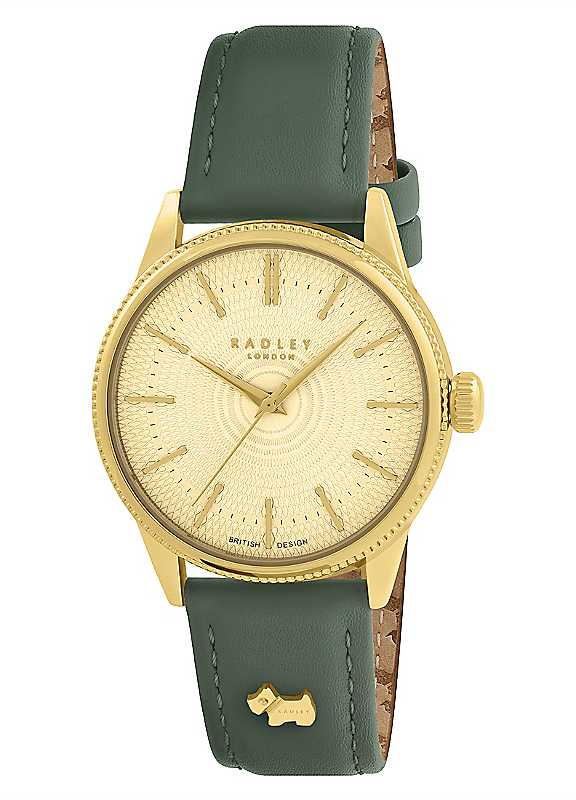 Radley Lewis Lane Ladies Coin Edge Bezel Watch. This watch features a round polished gold case with coin edge style bezel, Radley dog charm and a tapered dark green leather strap. Includes Radley gift box and 2 year guarantee.Brand: Radley LondonDragon Green Leather StrapRound Polished 18ct Gold Plated CaseCoin Edge Bezel DesignVery Pale Champagne Satin Dial | round ladies watch, round watch, gold plated watch, leather watch, leather watch band, green leather watch, watches analog, ladies analog watch, leather watch strap, gold leather watch, ladies gold watch