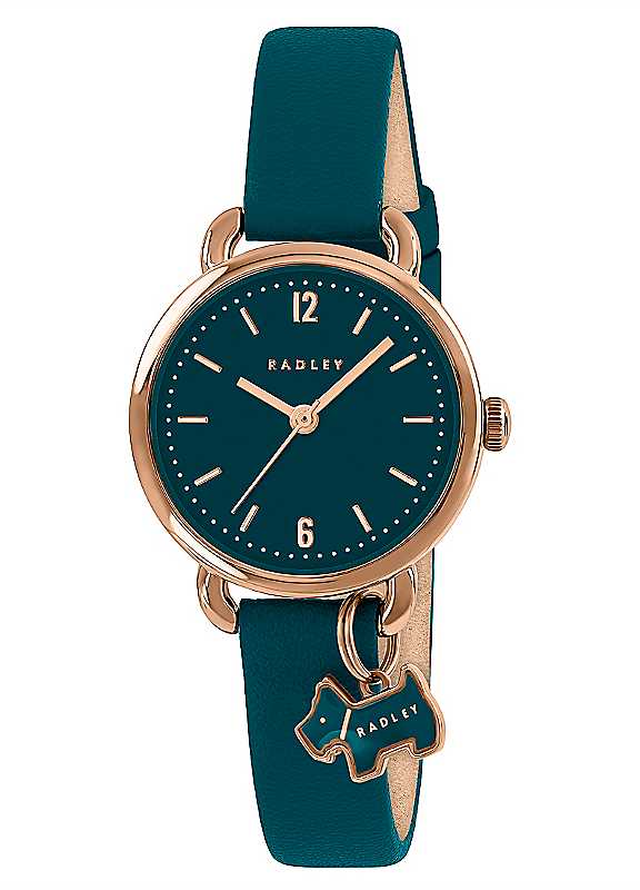 Radley London Bishops Lane Teal Leather Strap Watch. Soft and rounded, Bishops Lane features a petite 26mm polished rose gold case with open shoulders. With subtle rose gold detailing and a striking teal gloss dial, this watch is beautifully finished with a teal genuine leather strap and is fastened with a traditional polished rose gold buckle. Presented in a beautiful Radley London giftbox, with 2 year guarantee.Leather