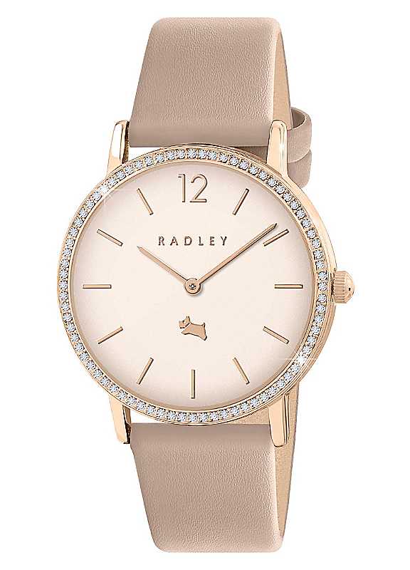 Radley London Mill Bay Iconic Porcini Leather Strap. Iconic, the Mill Bay features a 35mm stone set polished rose gold case. Designed to dazzle, the warm rose gold satin dial creates a sophisticated and captivating look. The watch is finished with a warm porcini genuine leather strap and traditional polished rose gold buckle. Presented in a beautiful Radley London giftbox, with 2 year guarantee.Leather
