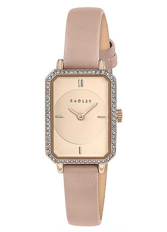 Radley Rose Gold Plated Leather Strap Watch. This elegant watch features a sleek rectangular case in polished rose gold plating, offering a soft, feminine touch. The dial is finished in a pale rose gold satin with a textured debossed centre, creating a subtle shimmer and added depth. Paired with a smooth prairie pink leather strap and a classic buckle fastening for everyday elegance. Presented in a beautiful Radley London giftbox, with 2 year guarantee.Rose gold plated rectangular casePink leather strapPale rose gold satin dialGold Plated | leather watch strap, rectangular watch, casual watch women