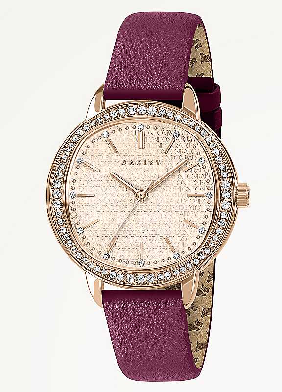 Radley London Rose Gold Plated Stone Set Berry Leather Strap Watch. This elegant 36mm watch features a polished rose gold case with a clear Czech stone set bezel and a curved mineral lens. The very pale rose gold satin dial showcases deep etch detailing, rose gold detailing and clear Czech stone markers. Finished with a slightly tapered soft genuine leather strap, this piece combines modern charm and style. Presented in a beautiful Radley London giftbox, with 2 year guarantee.Berry Genuine Leather StrapPolished Rose Gold Plated CasePale Rose Gold Satin