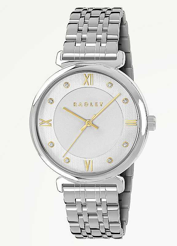 Radley London Silver T-bar Bracelet Watch. This refined 35mm watch features a polished silver T-bar case with a curved clear mineral lens. The dial showcases a very pale silver-white finish, accented by polished pale gold detailing and clear Czech stone markers. Finished with a seven-link stainless steel bracelet and secured with a polished silver butterfly clasp. This watch exudes modern elegance. Presented in a beautiful Radley London giftbox, with 2 year guarantee.Polished Silver Solid Stainless Steel BraceletPolished Silver Plated CasePale Silver White Dial