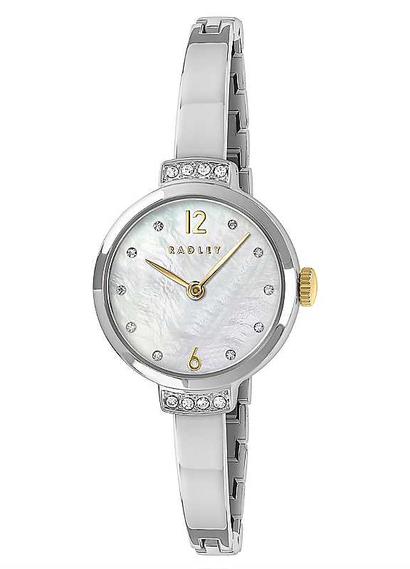 Radley Two Toned Silver and Gold Plated Bangle Watch.This exquisite watch features a polished 23mm silver case adorned with clear Czech stones on the shoulders. The genuine white mother-of-pearl dial is accented with gold highlights, adding a touch of elegance. Finished with a polished silver half bangle bracelet and double jewellery clasp. This watch artfully marries contemporary design with luxurious sophistication. Presented in a beautiful Radley London giftbox, with 2 year guarantee.Alloy, Silver & Gold Plated