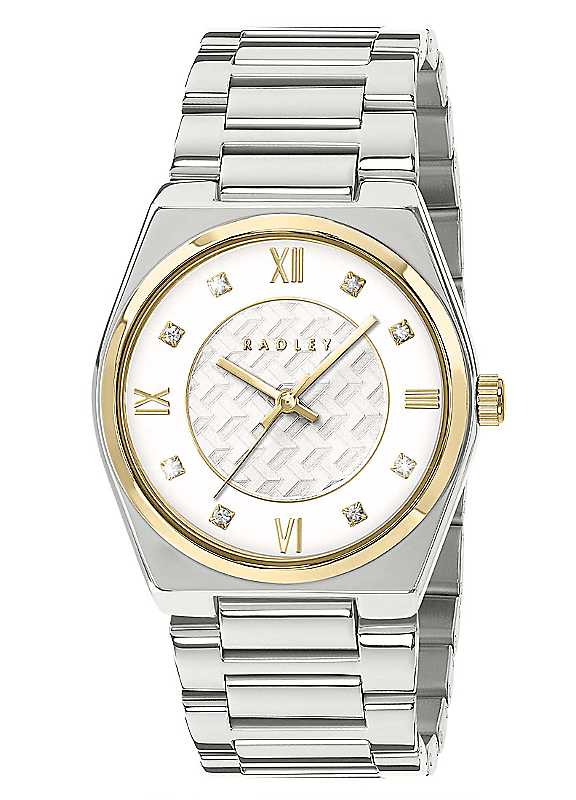 Radley Two-Tone Silver and Gold Watch. This elegant watch features a polished silver-tone round case beautifully accented with a warm gold bezel and matching crown for a striking two-tone finish. The dial is finished in pale silver-white satin, showcasing a sophisticated mix of sparkling stone hour markers and classic gold Roman numerals for a refined, contemporary look. Completed with a coordinating silver bracelet and secured with a butterfly clasp with pushers for a smooth, secure fit. Presented in a beautiful Radley London giftbox, with 2 year guarantee.Silver plated case with gold plated bezelSilver braceletPale silver white satin dialGold Plated | silver plated watch, gold silver watch, round watches ladies, watches stones, butterfly clasp watch, roman numeral watches, classic gold watch, silver bracelet watch, gold plated watch