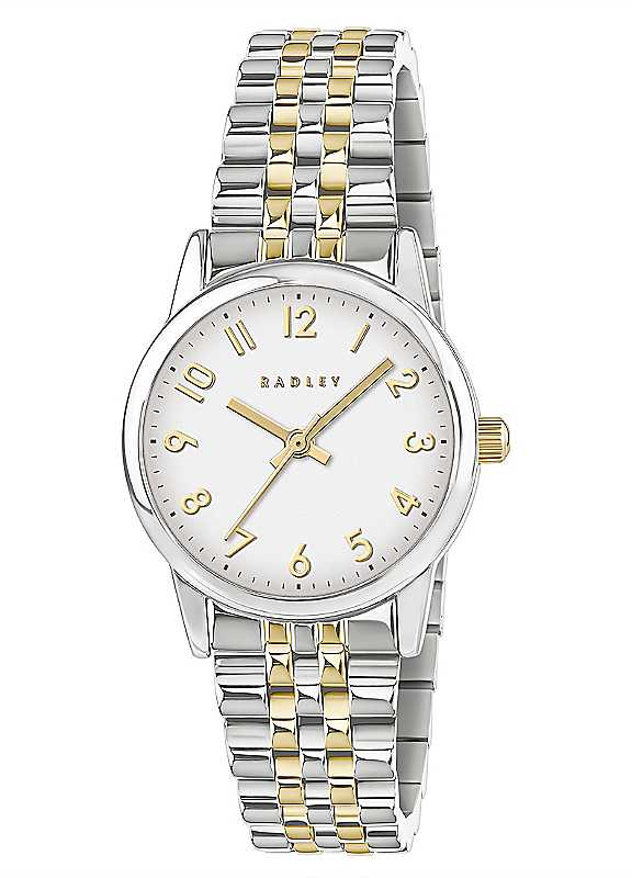 Radley Two-Tone Bracelet Watch. This elegant watch features a polished silver-tone round case with a contrasting gold crown, adding a subtle touch of warmth to the classic design. The dial is finished in pale silver satin and features full gold-tone numeral hour markers for clear, timeless style. The two-tone bracelet blends silver and gold links for a versatile, refined look, and is secured with a butterfly clasp with pushers for a smooth, secure finish. Presented in a beautiful Radley London giftbox, with 2 year guarantee.Silver plated case with gold plated crownTwo tone braceletPale silver satin dialGold Plated