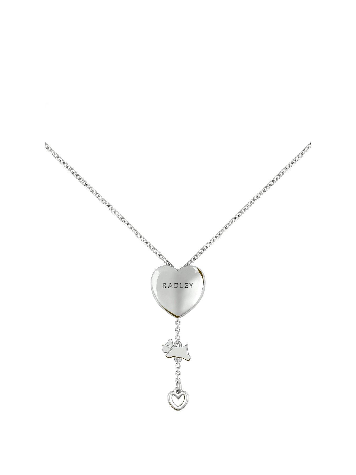 Radley Silver Plated Heart Lariat Necklace Radley Silver Plated Heart Lariat Necklace.This playful silver plated statement piece is perfect for layering. Featuring a polished Radley etched heart charm fixed to a fine 51cm chain and an additional iconic Radley jumping dog charm which can be adjusted to move in and out of the heart. Presented in a beautifulRadley London gift box. Depth: 5.3 MM Width: 14.5 MM Silver Plated Moving Radley Dog Charm Central Heart Charm
