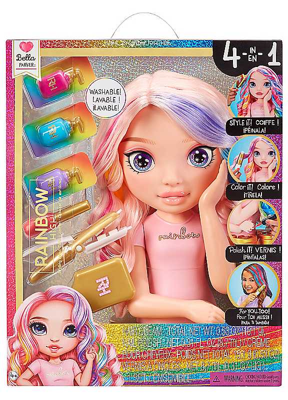 Inspire Creativity: Introducing our first Rainbow High Styling Head 4 in 1 playset. It's your turn to style, colour, and play- over and over again. You can even use the colour creams on your own hair and nail polish for your nails! Then, just rinse and repeat and do it all over again.Style It! This 13 ins Bella Styling Head has beautiful long light pink hair with curls and is easy to create endless hairstyles. Use the included brush to create fun hairstyles like braids, ponytails, buns, and so much more.Colour It! It's so easy to colour her hair. Pick your favourite colour (pink, blue, purple) and simply add it to the colouring tool. Then use it just like a straighter to add colour to the hair. You can add multiple colours. And you can wash it out and do it over and over again.Nail Polish To Paint It! Finally kids can practice painting nails with the included nail polish. Just paint the styling head's nails. And if you mess up or even want to do it again, just use a wet towel to wipe it all away. and start over again. It's so easy!For You Too! Colour your hair and nails too. Just use the included tools to add colour to your hair and nail polish to your nails. Note: colour will be more vibrant on lighter hair.Rinse And Repeat! So easy to do it over and over again. Just wash the hair in soap + water, let dry and start creating again! And for the nails, just use a wet towel to wipe it all away.What's Included: 1 Styling Head, hairbrush, 3 colour cremes, hair colouring tool, nail polish, and spoon.Watch On YouTube And Netflix: Watch the new episodes of the Animated Series on YouTube. And catch up from the beginning on Netflix. Just search for Rainbow High Dolls'.Age suitability: 4+ yearsWARNING! Choking Hazard-Small parts.Not suitable for children under 3 years.