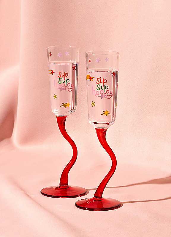 Chin Chin' with this pair of unique glasses fit for any type of bubbles! Lovingly designed by Raspberry Blossom®. Exclusively available, these wavy stemmed glasses are a super stylish glass. I say yes to 'sip sip hooray'! Designed in collaboration with Raspberry blossom we bring you a joyful branded collection of homeware and decorative gifts, inspired by the illustrations from this award-winning greeting card brand.Brand: Raspberry BlossomSet of 2 | cocktail glasses, champagne flutes, drinking glasses