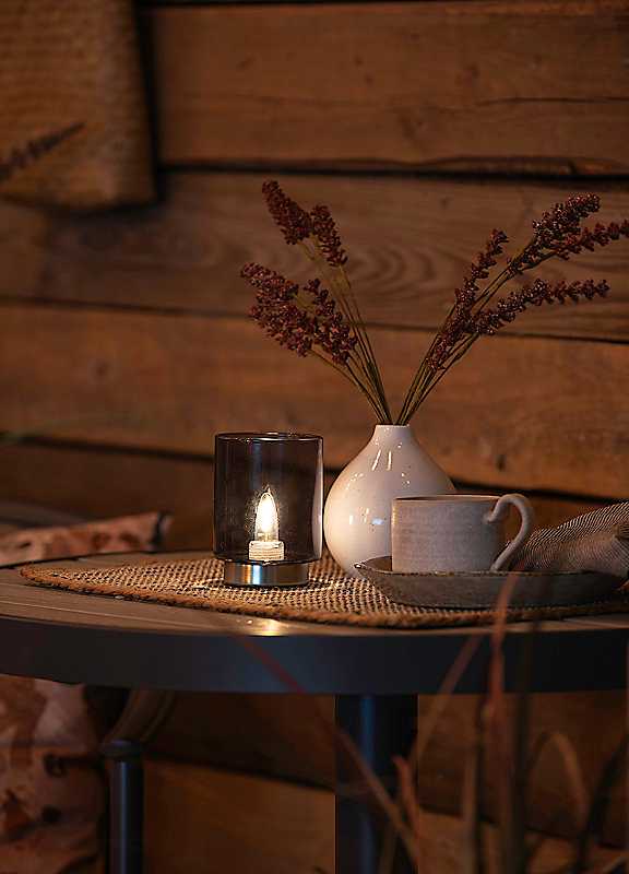 This indoor USB rechargeable candle lantern makes a splendid centre piece at the dining table or as a decorative light around the home, or even as a night light in bedrooms or dark hallways. The base is made from silver coloured brushed metal with a screw-in smoked glass shade above. The replaceable warm white LED can be set to flicker for a real flame effect, without the fire risk, or a dimmable, steady-on function as a table or shelf light operated from a button beneath the base.LED rechargeable candle - 1.8 m USB lead for rechargingDimmableSize approx. 11H x 8W cm | battery candle light, electric candle light, battery operated candle, led candle in glass, modern table accent, led battery candle, contemporary home accent, battery powered candle, glass candle lantern