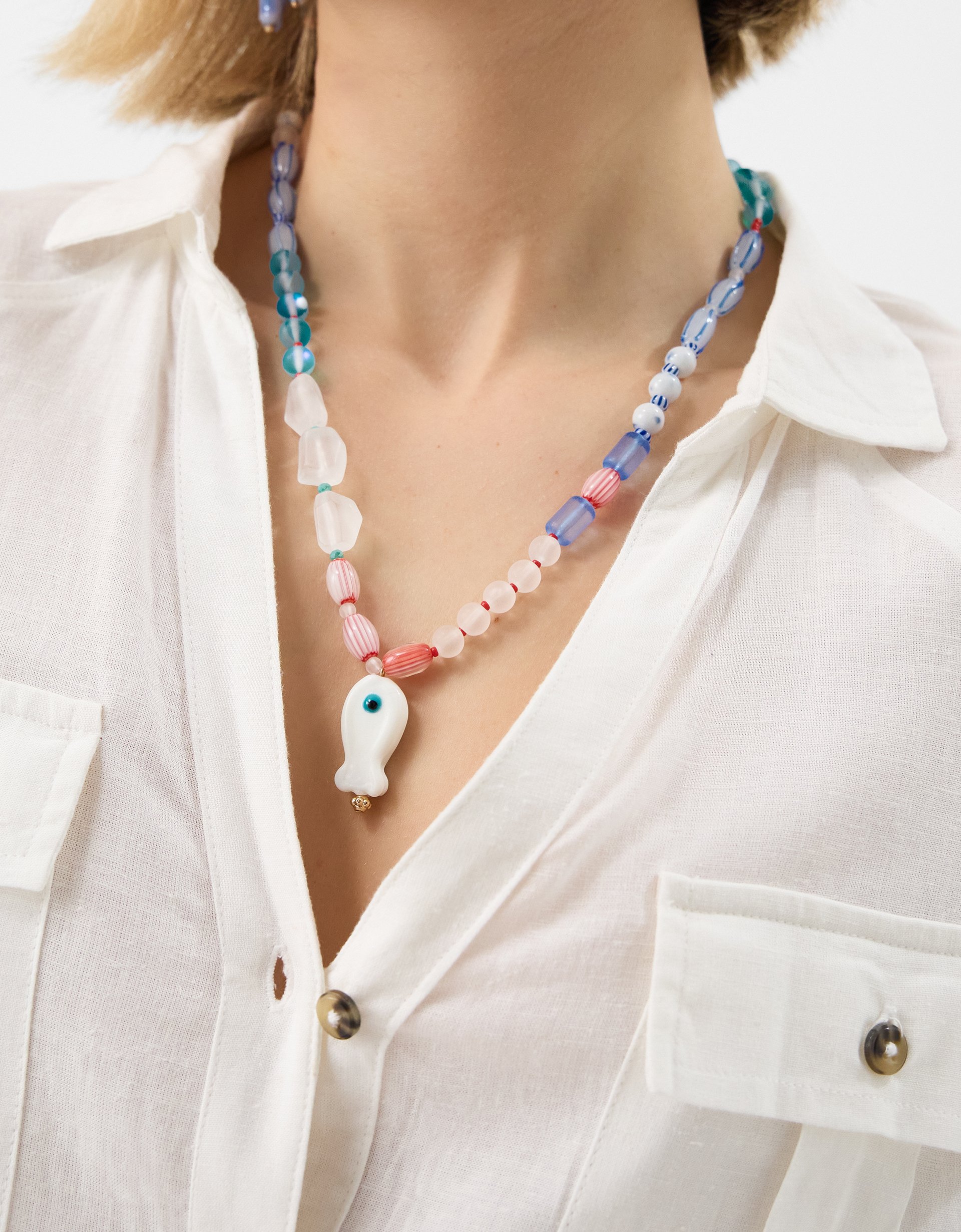 Sure to make a splashy style statement every time you slip it on, this necklace is strung with frosted beads in a range of ocean-inspired hues. Complete with a ceramic fish pendant, it'll make heads turn. Style with swimwear and the matching bracelet pack for a winning look!