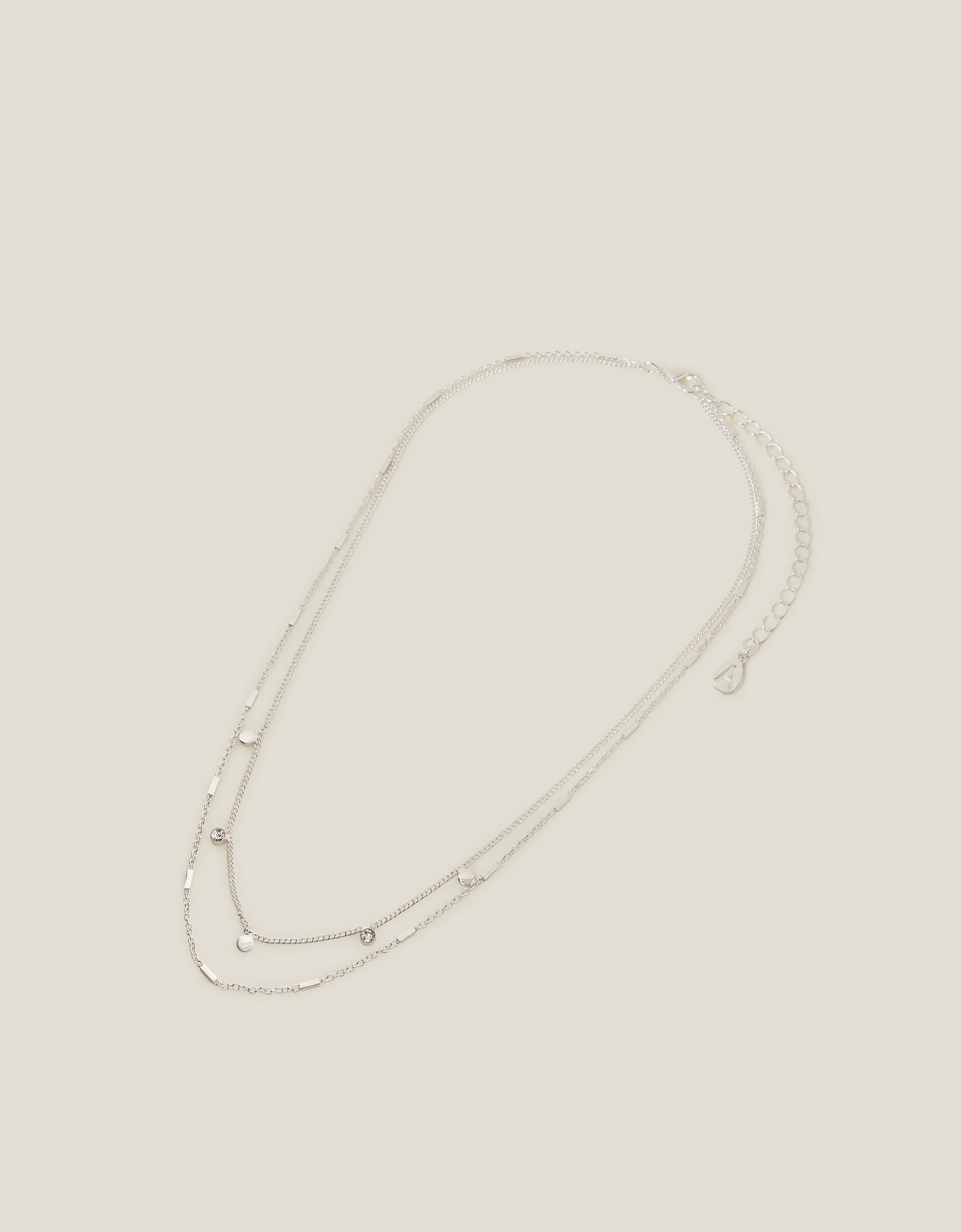 Low effort, high reward. Stationed with twinkling gem charms and bar detailing, this layered necklace is designed with silver-tone metal and an adjustable lobster clasp.