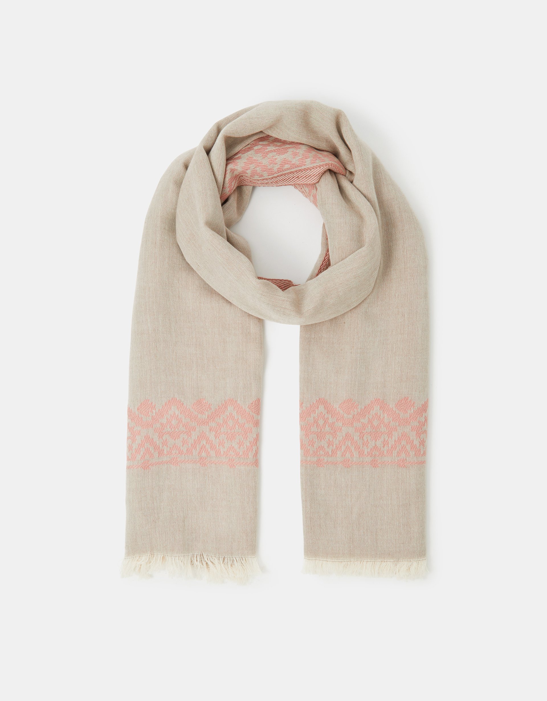 A winter warmer, this scarf has been embroidered with a decorative Jacquard pattern and finished with a fringed-border. Cute, right?