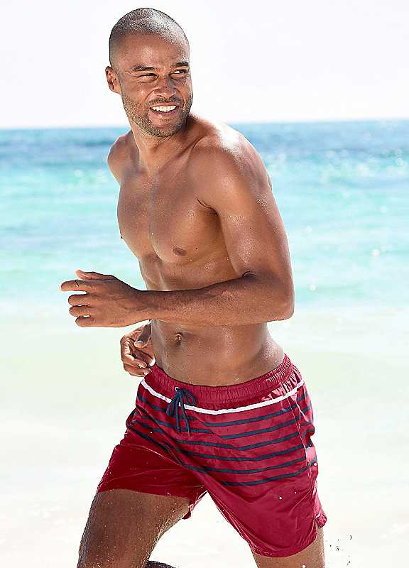 Cool red and navy stripe swim shorts with elasticated waistband with outer cord, side pockets and inner lining with small inner pocket.Homeboy Swim Shorts Features: Colour: Red Washable 100% Polyester Inner lining: 100% Polyester Short inside leg approx. 40 cm (15¾ in) Long inside leg approx. 48 cm (19 in)