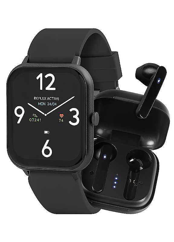 With its advanced calling features and sleek design, the Reflex Active Series 17 Smart Watch and True Wireless Earbud bundle brings you the ultimate set for those seeking a well-rounded and feature-packed wearable experience. Make and receive calls directly from your wrist, providing convenient hands-free communication wherever you go. Stay connected and never miss an important call again, all without reaching for your smartphone.Your well-being is a top priority, and the Reflex Active Series 17 understands that. It features intelligent health reminders that promote a balanced and mindful lifestyle. Stay on track with gentle reminders for hydration, movement, and other essential self-care activities. This smartwatch serves as your personal wellness coach, encouraging you to prioritize your health throughout the day.It offers an extensive range of fitness activities to help you achieve your goals and maintain an active lifestyle. Track your steps, distance, and calories burned throughout the day whilst using the heart rate monitor to ensure you are exercising in your optimal heart rate zone.The black earbuds have a 5 Hour total Playing Time with over 20 hours of play time which is combined with a 10m Wireless Range. With this powerful combination, you can stay connected, entertained, and engaged in all your activities, while still enjoying the convenience of a wire-free audio solution.But that's not all - the Reflex Active Series 17 goes above and beyond to deliver a seamless and user-friendly experience. Its intuitive interface provides quick access to all your essential features and notifications, keeping you informed and in control. The vibrant and responsive touch screen makes navigation a breeze, while the durable and stylish design ensures it can withstand your daily adventures.Whether you're a tech-savvy professional, a fitness enthusiast, or someone who simply hands-free music at the touch of a button, this watch and earbud set is your ideal companion. Stay connected, entertained, and motivated as you embrace a well-rounded and active lifestyle.The watch features a square case with a soft silicone strap. Each set is packed in a Reflex Active presentation gift box complete with instruction manual, USB charger (sealed rechargeable battery) and 2-year manufacturer guarantee. Download the free Reflex Active Red App now to explore in more detail. IOS & Android Compatible.Brand: Reflex Active | black wireless earbuds, workout earbuds, smart watch fitness watch, smart watch with earbuds, digital bluetooth watch, rechargeable digital watch, digital smart watch
