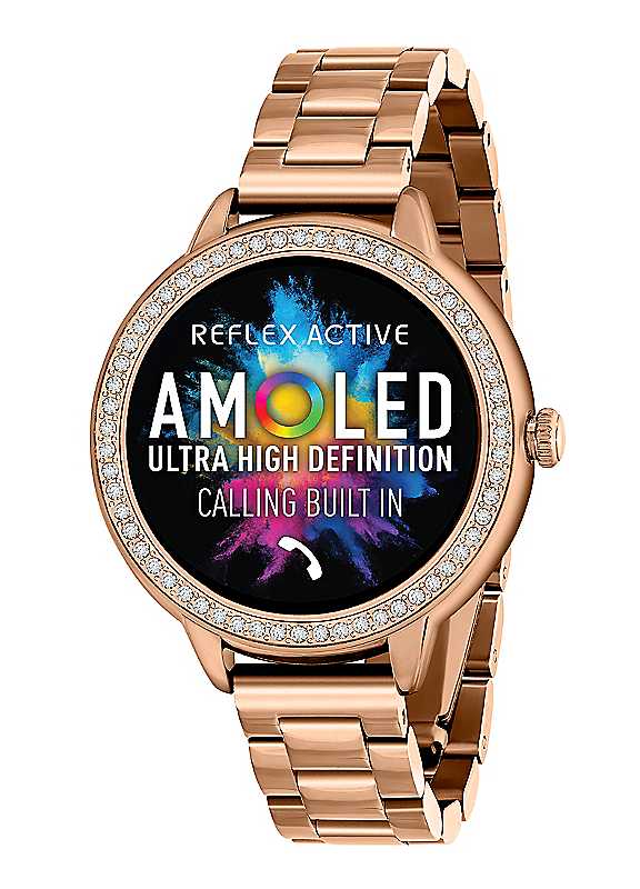 Experience Reflex Active in ultra-high definition, with our Series 41 stone set Amoled smart watch. Enjoy an amazing collection of exclusive dials on the 1.1'' Amoled display with exceptional clarity and incredible colour reproduction.Innovative additional benefits include Always-On display, meaning you no longer need to touch your watch or lift your arm to activate the display. Our dual time feature shows the time home and away, to ensure you always keep on track while travelling.Stay connected wherever you are; make and receive calls directly to your watch and enjoy the convenience of messages and social notifications on your wrist.The Series 41 offers all the lifestyle and wellness features you need, including helpful health benefits like step count, heart rate, blood oxygen, calories and sleep analysis. You'll also enjoy music control, GPS connection, camera control and so much more!Personalise your watch with an incredible choice of exclusive Reflex Active dials, including animated displays. For a truly unique display, use a photo from your phone gallery.Our IP68 water resistance rating makes this smart watch the perfect partner for all activities, keeping you on track for all your fitness goals!Our smart watches are presented in a gift box complete with instruction manual, USB and a 2-year guarantee. Download the free Reflex Active Red App to enjoy additional functionality. IOS 12+ and Android 8.0+ Compatible.Brand: ReflexMB memoryCompatible with iPhone & AndroidBluetooth 5.2 connection27.94mm AMOLED screenTouchscreen360 x 360 screen resolutionBattery - Typical usage time of up to 4 days. Low usage time of up to 10 days. 3 hour chargeWatch size - H50 x W37 x D11mmW14, T2mmStrap can be removed and replacedWater resistantDust resistantMake callsAnswer callsRead textsRead emailsReceive social network notificationsDisplays weatherMusic playerHeart rate monitorDistanceAccelerometerGPSCaloriesSleepAccessories included: Charger and Guarantee, including chargerManufacturer's 2 year guarantee
