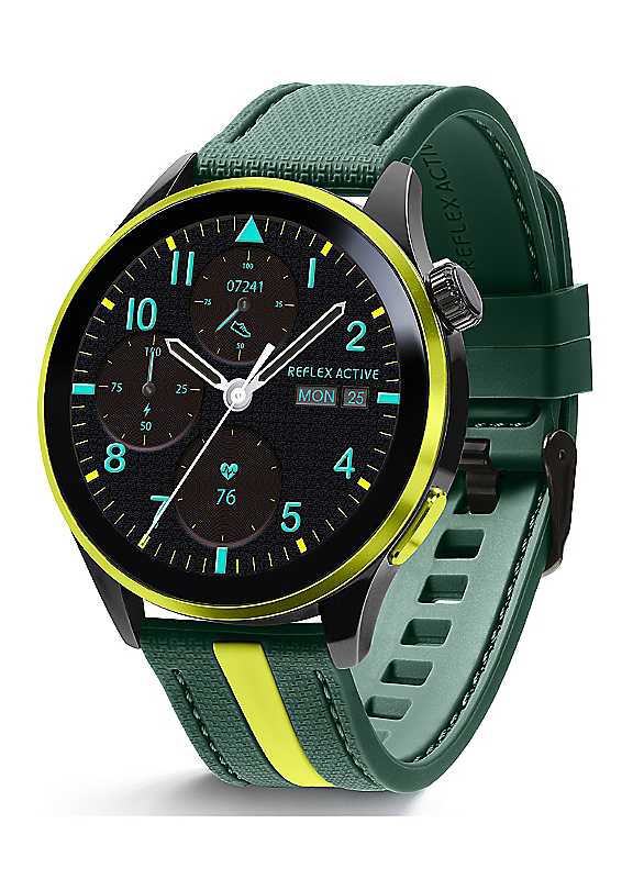 The Reflex Active Series 54 sports calling smart watch with built in GPS tracks your exercise routine by satellite navigation ensuring your data and route are precisely recorded for an accurate training programme.Series 54 has ABC functionality (altimeter, barometer and compass) providing you with elevation data for ascent and descent, atmospheric pressure reading and an electronic compass.AMOLED Always-On display shows the time without moving your wrist.Black and Green combination double injection silicone strap.Make and receive calls from your watch.The watch dials are interchangeable with a variety of options to choose from. You can also upload dials from the extensive Reflex Active dial library via the App or even create your own using personal photos from your phone.Download the free Reflex Active Red App to enjoy additional functionality. iOS 12+ & Android 9.0+ Compatible.Connectivity: Bluetooth 5.2 connection35.56mm AMOLED screenTouchscreen466 x 466 screen resolutionBattery: 350mAh battery capacity / Typical usage time of up to 4 days / Low usage time of up to 10 days / 3 hour chargeSize: one size strap fits 145 - 215mm wristsWatch size - W46 x D11mmStrap size - L250 x W22 x T3mmStrap can be removed and replacedHealth & Fitness Features: Workouts / Heart rate monitor / Sleep trackingTech Features: Displays weather / Music player / Smart phone notifications / GPS / Compatible with apps from the Google play store, Apple app storeWater resistantDust resistantSleep trackingManufacturer's 2 year guarantee
