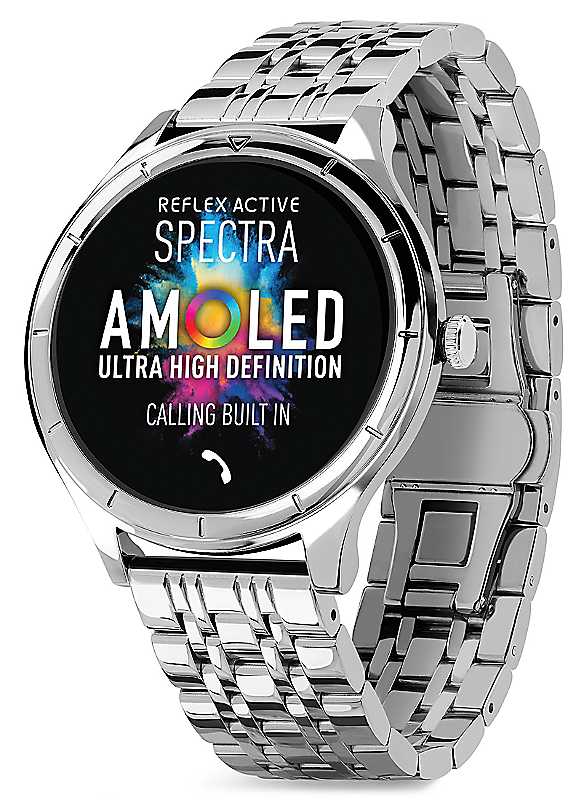 Experience Reflex Active in ultra-high definition with the Spectra AMOLED smart watch. Enjoy an amazing collection of exclusive dials on the 1. 43 in AMOLED display with exceptional clarity and incredible colour reproduction, coupled with a slim case and stainless steel bracelet. Innovative additional benefits include Always-On display, meaning you no longer need to touch your watch or lift your arm to activate the display and our Dual-Time feature shows the time home and away, to ensure you always keep on track while travelling. Stay connected wherever you are, make and receive calls directly to your watch, and enjoy the convenience of messages and social notifications on your wrist. Spectra offers all the lifestyle and wellness features you need, including helpful health benefits like step count, heart rate, blood oxygen, calories and sleep analysis. You'll also enjoy music control, GPS connection, camera control and so much more to explore! Scroll through your watch smoothly with crown navigation, or use the full touch screen if that's your preference. Personalise your watch with an incredible choice of exclusive Reflex Active dials or for a unique display, use a photo from your phone gallery. IP68 water resistant. IOS 12. 0+ and Android 9. 0+ Compatible. Compatible with iOS and AndroidBluetooth 5.2 connectionDisplay - 36.32mm AMOLED screen / Touchscreen / 466 x 466 screen resolutionBattery - 220mAh battery capacity / Typical usage time of up to 4 days / Low usage time of up to 10 days / 3 hour chargeSize: one size strap fits 220 - 220mm wristsW45 x D9mmStrap can be removed and replacedWeight 119gHealth & Fitness Features: Workouts / Running / Cycling / Hiking / Heart rate monitor / Sleep trackingTech Features: Displays weather / Music player / Smart phone notifications / GPSCompatible with apps from the Google play store, Apple app storeFall detectionWater resistantDust resistantAccessories included: Instruction Manual, USB Charger, including chargerManufacturer's 2 year guarantee