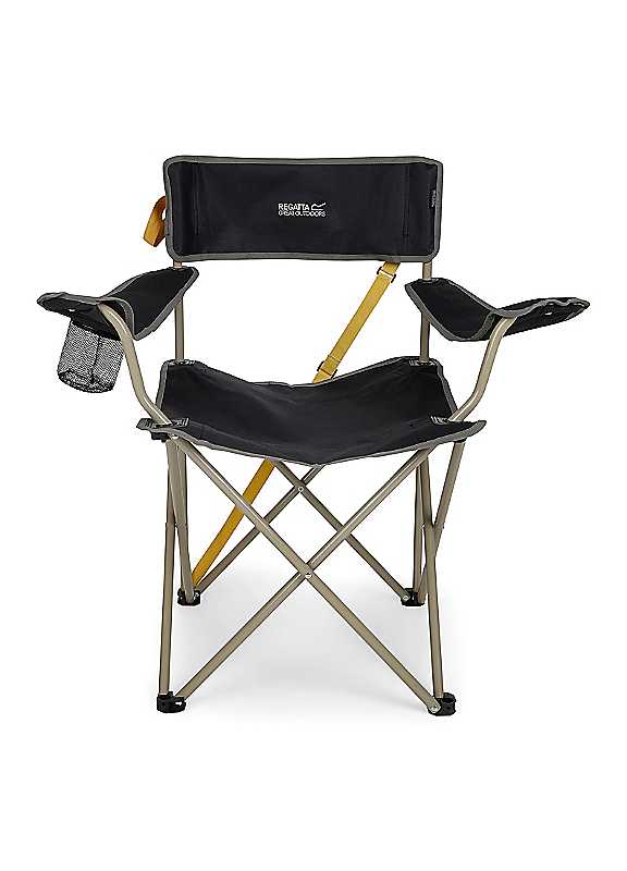 The Isla II Chair from Regatta is a camping must-have. The durable polyester fabric and sturdy steel frame can support up to 90kg. The camping chair comes with an integrated drinks holder and a handy storage strap.Dimensions: H80 W75 x D50cmWeight of Product: 1.9kgSpecifications Material: 70% Steel; 20% Polyester; 10% PlasticsManufacturer's 1 year guaranteeProduct Care: Wipe clean only. See label for full instruction | outdoor furniture steel, durable outdoor furniture, black camping chair, foldable camping chair, camping chair with cup holder, outdoor camping chairs