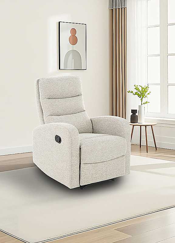 This image shows a natural fabric-upholstered recliner chair. The seat has a cushioned backrest divided into three horizontal sections for enhanced support. The seat is plush and ergonomically curved. A black manual lever on the left side allows users to recline the seat manually. The armrests are padded and rounded for comfort, and the base includes a metal frame that supports the reclining mechanism.Weight of Product: 29 kgWeight Capacity: 136 kgLeg Height: 1 cmArm Height: 19 cmSeat Dimensions: 53 cmBack Dimensions: 67 cmFloor to Seater: 46.5 cmSuggested Number of People for Assembly: 2Minimal AssemblyTool Kit ProvidedManufacturer's 1 Year GuaranteeWipe clean only, avoid household cleaners/abrasivesFabric, WoodOverall assembled dimensions approx. 101H x 74W x 94D cmPlease remember to measure your available space before ordering. If using on an un-carpeted floor we recommend rubber or felt protection pads be used under the legs to avoid damage to your floors.