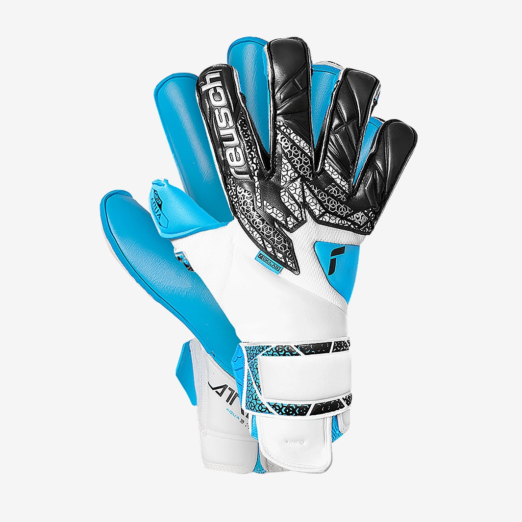 Take command of the game with Reusch Attrakt Aqua Evolution goalkeeper gloves in WhiteBlackAqua Blue, featuring more latex coverage than ever for superior ball contact and grip. Upgraded with additional latex wraps at the fingers, thumb, and side of the hand, the design gives you complete control when catching, handling, and throwing the ball. As well as more grip, the extra latex provides greater structure to the glove for an anatomical, supportive fit.The base backhand material is nextgen too. A 2mm layer of foam sandwiched between two layers of recycled polyester, Reuschs PerformSkin offers stability, flexibility, and breathability for maximum comfort during play.On the palm, the Attrakt Aqua boasts Reuschs matchquality Aqua latex with Hydrograin particles, which activate in wet conditions to ensure confident handling in even the heaviest rain. While it excels in the wet, Aqua foam also performs well in the dry many of Reuschs pro keepers wear Aqua latex all year round.The AdaptiveFlex closures duallayer construction stretches to accommodate a wider range of wrist shapes and sizes, while maintaining a tight, secure feel to give you full confidence in your gloves. Attrakt range endorsed by Alisson Becker Cut Evolution Cut Palm ReuschGrip Aqua Wrist Closure AdaptiveFlex Elastic strap inverted direction with rubber ender Backhand Base T Textile, B PerformSkin Punching Zone Latex Gussets Textile Extended Grip Zone AirVentSystem Preshaped construction 3D Thumb Crotch Thumb Wrap Side Wrap AdaptiveFlex closure system