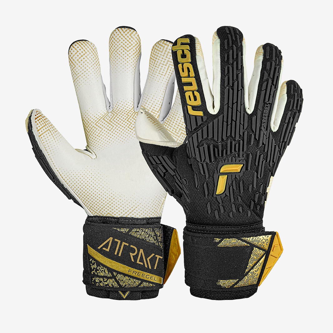 Make elitelevel saves with Reusch Attrakt Freegel Gold X GluePrint Finger Support goalkeeper gloves in BlackGold. Featuring a ReuschGrip Gold X palm with new GluePrint technology, the Reusch Attrakt Gold X GluePrint provides extrasticky grip in wet and dry conditions thanks to the addition of an adhesive print in targeted areas. The gloves Evolution Cut features a mainly flat palm but then seamlessly rolls the latex around the fingertips, giving you the perfect combination of a snug fit and direct control of the ball. On the backhand, a more widely dispersed application of Freegel silicone adds stability to the punching zone while maintaining flexibility. Finger Support protection prevents backward flex to help guard against injury, with the spines adapting to the shape of your fingers to allow a natural grasping motion without putting them at risk. Cut Evolution Cut Latex ReuschGrip Gold X with GluePrint technology Wrist Closure Elastic cuff with pull loop, neoprene full strap with rubber ender Backhand Freegel Reusch Finger Support Preshaped Construction 3D Thumb Crotch Rolled Thumb Please note GluePrint will wear away over time, but the Gold X latex underneath will continue to provide exceptional grip