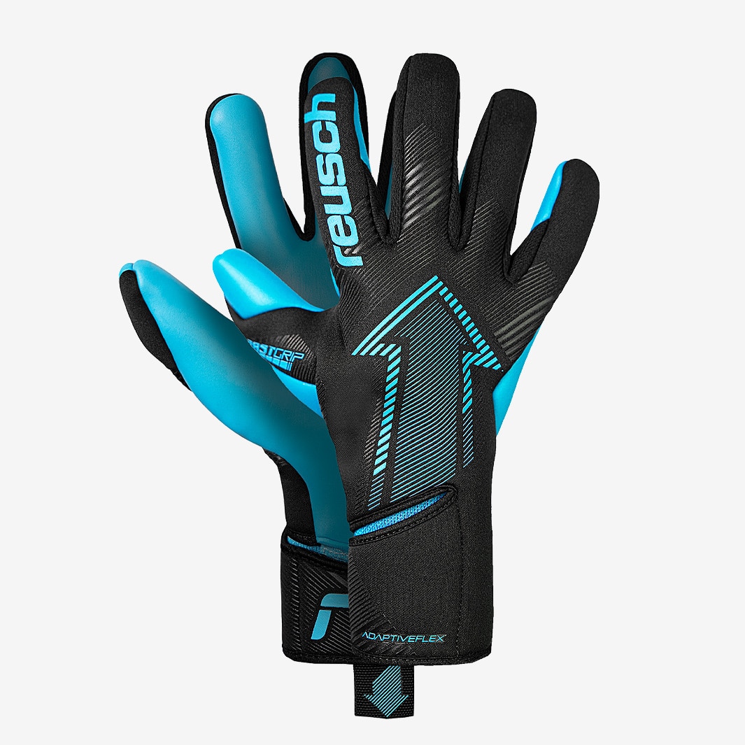 React faster than ever wearing Reusch Fastgrip Aqua goalkeeper gloves in BlackAqua Blue. Taking up the mantle as Reuschs flagship lightweight series, Fastgrip gloves provide unmatched comfort and responsiveness with an allnew construction.The Aqua edition features the AdaptiveFlex 2.0 closure system, an evolution that combines the best elements of strapped and strapless designs. The elastic bandage underneath ensures flexibility around the wrist, then the top layer wraps around for stability and support. Essentially, the glove becomes the strap, neatly securing the fit while retaining an integrated, fussfree feel.For improved performance, the angled cut of the AdaptiveFlex cuff allows extended latex coverage on the palm, offering even more grip when catching and handling. Further wraps on the thumb and outer side of the hand amplify the effect.The latex formula is ReuschGrip Aqua, which excels in the wet and keeps performing in the dry many pros wear Aqua gloves all year round.On the backhand, Reuschs PerformSkin material sandwiches a 2mm layer of foam between two layers of recycled polyester for increased breathability and a more anatomical shape around the hand.And finally, youll notice the return of an iconic logo for the Fastgrip series. Thats right the Arrow is back, giving the gloves a bold, confident look. Cut Hybrid Negative Cut Palm ReuschGrip Aqua Wrist Closure AdaptiveFlex 2.0 with pull loop, integrated strap with rubber ender Backhand Base PerformSkin Gussets Textile Extended Grip Zone AirVentSystem Preshaped construction 3D Thumb Crotch Double Thumb Wrap Side Wrap AdaptiveFlex 2.0 Closure System