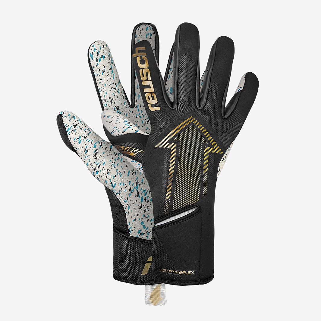 React faster than ever wearing Reusch Fastgrip Fusion goalkeeper gloves in BlackGold. Taking up the mantle as Reuschs flagship lightweight series, Fastgrip gloves provide unmatched comfort and responsiveness with an allnew construction. The Fusion edition features the AdaptiveFlex 2.0 closure system, an evolution that combines the best elements of strapped and strapless designs. The elastic bandage underneath ensures flexibility around the wrist, then the top layer wraps around for stability and support. Essentially, the glove becomes the strap, neatly securing the fit while retaining an integrated, fussfree feel. For improved performance, the angled cut of the AdaptiveFlex cuff allows extended latex coverage on the palm, offering even more grip when catching and handling. Further wraps on the thumb and outer side of the hand amplify the effect. The latex formula is ReuschGrip Fusion, featuring a combination of highly resistant latex black specks and wetweather focused latex blue specks for full control in all conditions. On the backhand, Reuschs PerformSkin material sandwiches a 2mm layer of foam between two layers of recycled polyester for increased breathability and a more anatomical shape around the hand. And finally, youll notice the return of an iconic logo for the Fastgrip series. Thats right the Arrow is back, giving the gloves a bold, confident look. Cut Hybrid Negative Cut Palm ReuschGrip Fusion Wrist Closure AdaptiveFlex 2.0 with pull loop, integrated strap with rubber ender Backhand Base PerformSkin Gussets Latex Extended Grip Zone Ventilation channels Preshaped construction 3D Thumb Crotch Double Thumb Wrap Side Wrap AdaptiveFlex 2.0 Closure System