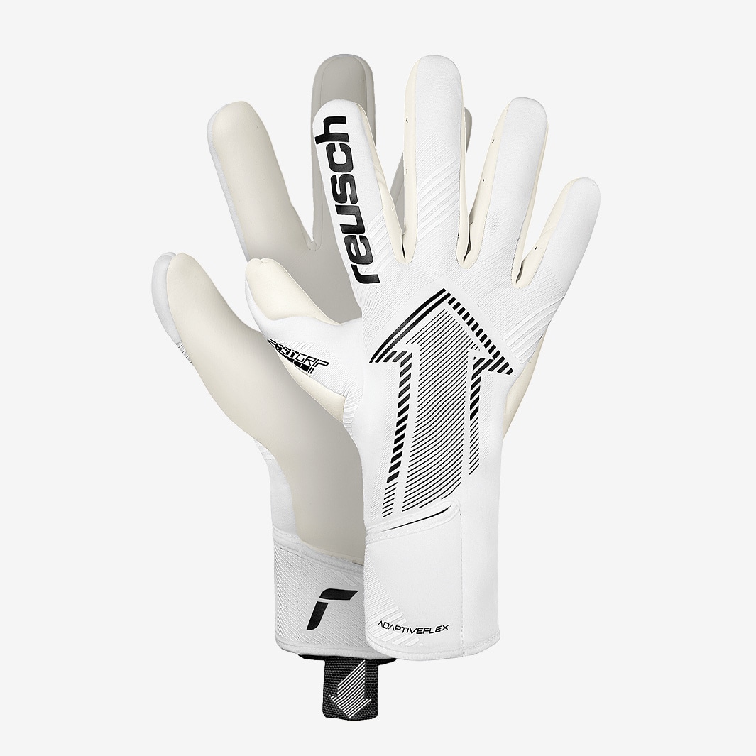 React faster than ever wearing Reusch Fastgrip Gold X goalkeeper gloves in White. Taking up the mantle as Reuschs flagship lightweight series, Fastgrip gloves provide unmatched comfort and responsiveness with an allnew construction. The Gold X edition features the AdaptiveFlex 2.0 closure system, an evolution that combines the best elements of strapped and strapless designs. The elastic bandage underneath ensures flexibility around the wrist, then the top layer wraps around for stability and support. Essentially, the glove becomes the strap, neatly securing the fit while retaining an integrated, fussfree feel. For improved performance, the angled cut of the AdaptiveFlex cuff allows extended latex coverage on the palm, offering even more grip when catching and handling. Further wraps on the thumb and outer side of the hand amplify the effect. The latex formula is ReuschGrip Gold X for elitelevel grip in all conditions. On the backhand, Reuschs PerformSkin material sandwiches a 2mm layer of foam between two layers of recycled polyester for increased breathability and a more anatomical shape around the hand. And finally, youll notice the return of an iconic logo for the Fastgrip series. Thats right the Arrow is back, giving the gloves a bold, confident look. Cut Hybrid Negative Cut Palm ReuschGrip Gold X Wrist Closure AdaptiveFlex 2.0 with pull loop, integrated strap Backhand Base PerformSkin Gussets Latex Extended Grip Zone Ventilation channels Preshaped construction 3D Thumb Crotch Double Thumb Wrap Side Wrap AdaptiveFlex 2.0 Closure System