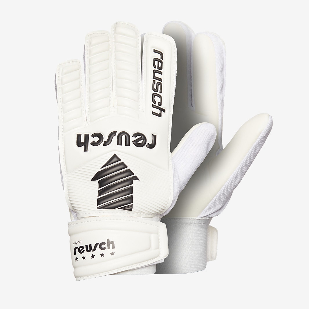 Make saves like a legend wearing Reusch Kids Legacy Arrow Solid goalkeeper gloves in White, a modern take on one of goalkeepings most famous designs. Featuring a ReuschSolid palm, the Reusch Kids Legacy Arrow Solid stands up to the additional friction associated with hard surfaces thanks to its highly abrasionresistant latex. The gloves Negative Cut gives you the tight, snug fit that many pro goalkeepers prefer, offering improved control and ball sensation. On the backhand, lightweight PVC provides extra power for punched clearances. Lookswise, the Legacy range takes inspiration from Reuschs long heritage in the game, featuring oldschool colours and graphics along with their original logo as used 30 years ago. A new addition to the series, the Legacy Arrow doubles down on the classic styling, featuring the iconic enlarged arrow on the backhand, as seen on the gloves of so many top keepers over the years. Palm ReuschSolid Cut Negative Cut Wrist Closure Elastic open cuff with half strap Backhand PVC