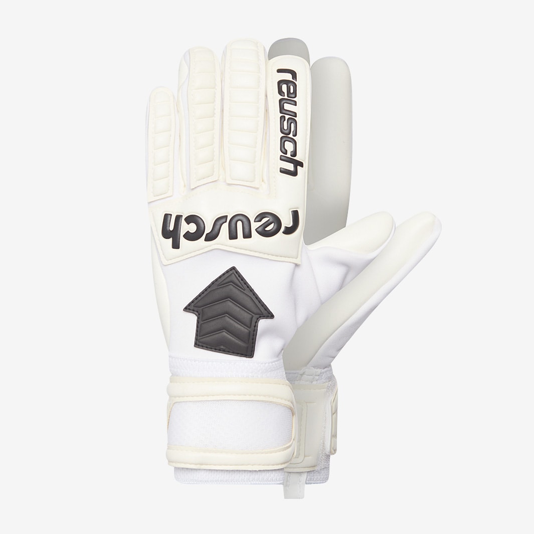Make saves like a legend wearing Reusch Legacy Arrow Gold X goalkeeper gloves in White, a modern take on one of goalkeepings most famous designs. Built with elitelevel Gold X latex, the Reusch Legacy Arrow Gold X provides amplified tackiness for reliable grip in both wet and dry conditions. The gloves popular Evolution Negative Cut ensures a snug fit, while the traditional latex backhand offers comfort and punching power in equal measure. A full strap closure keeps them secure. Lookswise, the Legacy range takes inspiration from Reuschs long heritage in the game, featuring oldschool colours and graphics along with their original logo as used 30 years ago. A new addition to the series, the Legacy Arrow doubles down on the classic styling, featuring the iconic enlarged arrow on the backhand, as seen on the gloves of so many top keepers over the years. Palm ReuschGrip Gold X Cut Evolution Negative Cut Wrist Closure Elastic cuff latex full strap with textile window Backhand Latex Ventilation channels Preshaped construction 3D Thumb Crotch Thumb wrap