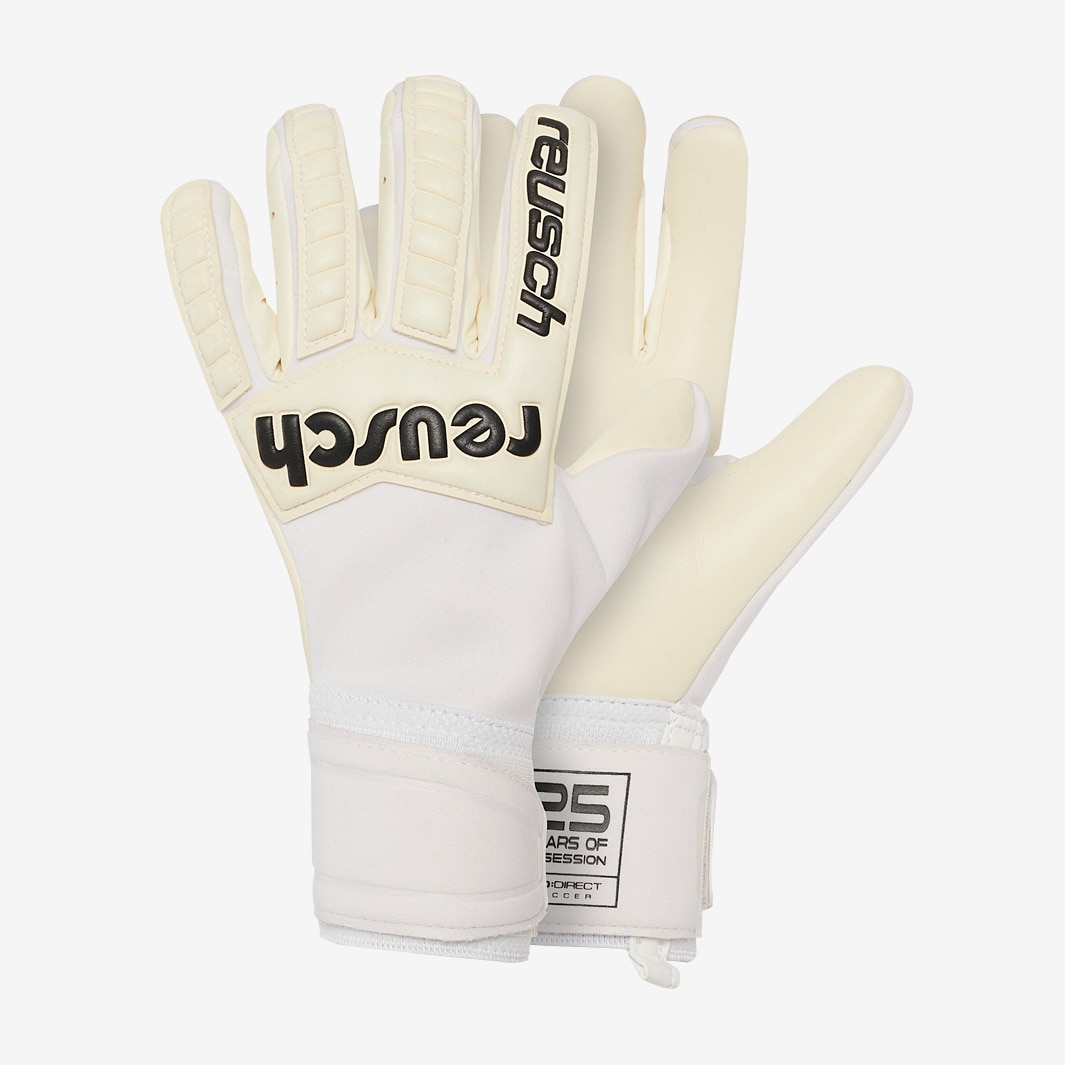 Make legendary saves wearing Reusch Legacy Gold X PD25 SE goalkeeper gloves in White, a modern take on one of goalkeepings most famous designs with special edition details honouring ProDirects 25th anniversary. 25 years of ProDirect, 25 years of obsession. To celebrate our anniversary year, weve partnered with the biggest brands in the game to bring back some of the best gloves and colourways from the past. This limited edition of the Legacy Gold X harks back to gloves worn in the 90s, featuring Reuschs oldschool logo and a dedicated space on the backhand for a single initial, so you can personalise it with a letter of your choice to create a truly unique design. Thats in addition to the PD anniversary branding on the wrist strap gloves dont get any more special than this. Techwise, the Reusch Legacy Gold X features elitelevel Gold X latex, which provides amplified tackiness for reliable grip in both wet and dry conditions. The gloves popular Evolution Negative Cut offers a snug fit, while the traditional neoprene and latex combo on the backhand offers comfort and punching power in equal measure. A full strap closure keeps them secure. ProDirect 25th anniversary special edition PD branding at wrist strap Palm ReuschGrip Gold X Cut Evolution Negative Cut Wrist Closure Elastic cuff latex full strap with textile window Backhand Latex neoprene Ventilation channels Preshaped construction 3D Thumb Crotch Thumb wrap