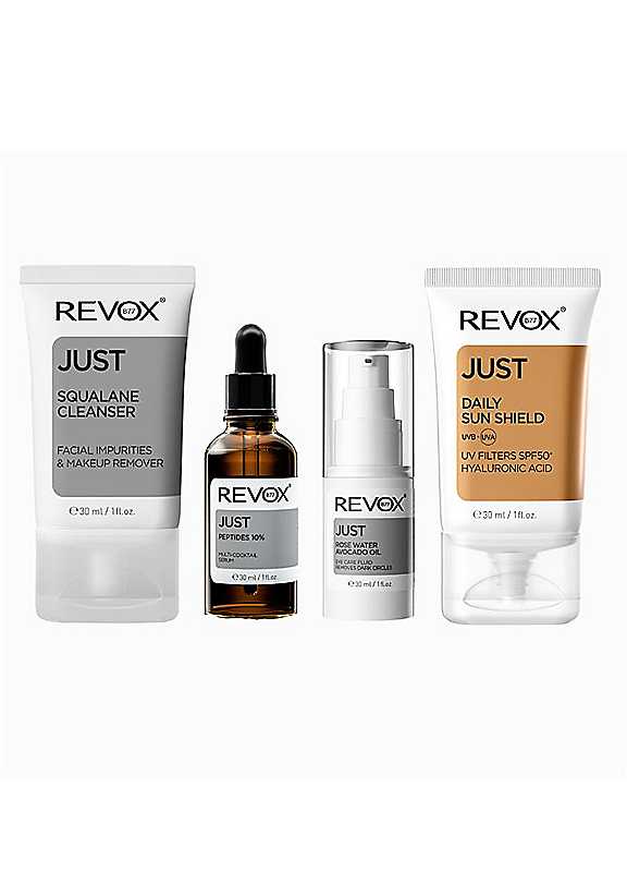 Revox B77 Just Anti Aging Care AM BundleSet Contains:- Revox B77 Just Squalane Cleanser 30ml - the ultimate facial impurity and makeup eliminator.- Revox B77 Just Peptides 10% 30ml - the building blocks of our skin.- Revox B77 Just Rose Water Avocado Oil Eye Care 30ml - the solution to dark under-eye circles, puffiness, and signs of aging.- Revox B77 Just Daily Sun Shield SPF50+ 30ml - shields your skin from pesky UVA rays while keeping it soft and moisturised.Brand: Revox