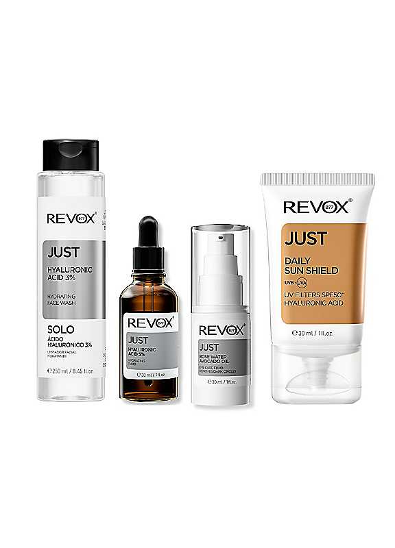 This Revox B77 skincare routine contains:Revox B77 Just Daily Sun Shield SPF50+ 30ml - shields your skin from pesky UVA rays while keeping it soft and moisturizedRevox B77 Just Hyaluronic Acid 5% 30ml - for notably purer, softer, and suppler skinRevox B77 Just Rose Water Avocado Oil Eye Care 30ml - the ultimate solution to dark under-eye circles, puffiness, and signs of agingRevox B77 Just Hyaluronic Acid 3% Hydrating Face Wash 250ml - for notably purer, softer, and suppler skinBrand: Revox