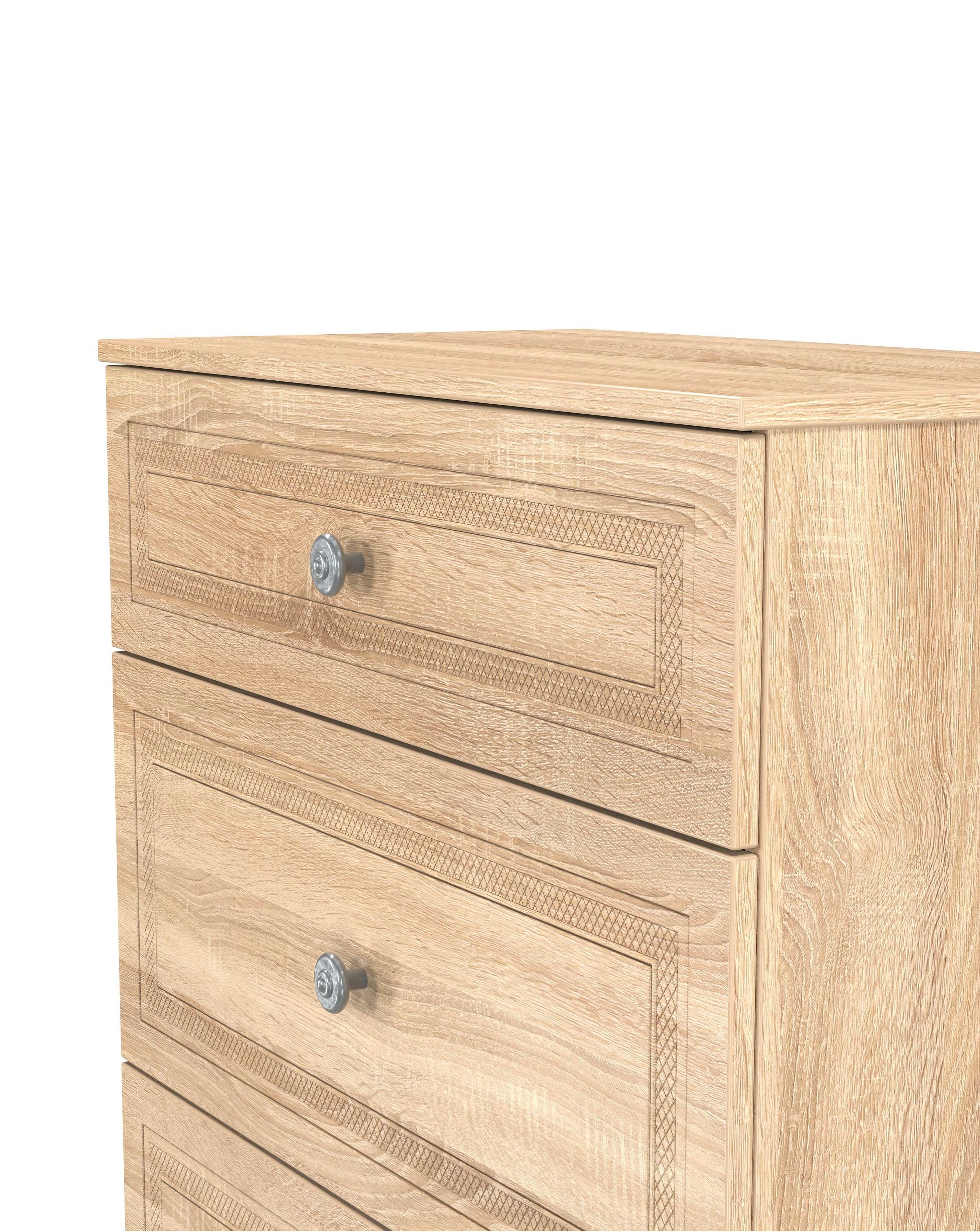 The Richmond 3 drawer chest features embossed detailing and pewter coloured brushed metal handles. Finished in an oak effect colourway and fully scratch resistant. This product is made to order in the UK, ready assembled for you to use as soon as it has been delivered. Please note: We are unable to deliver to Ireland, Scottish Islands, Isle of Wight and Isle of Man.