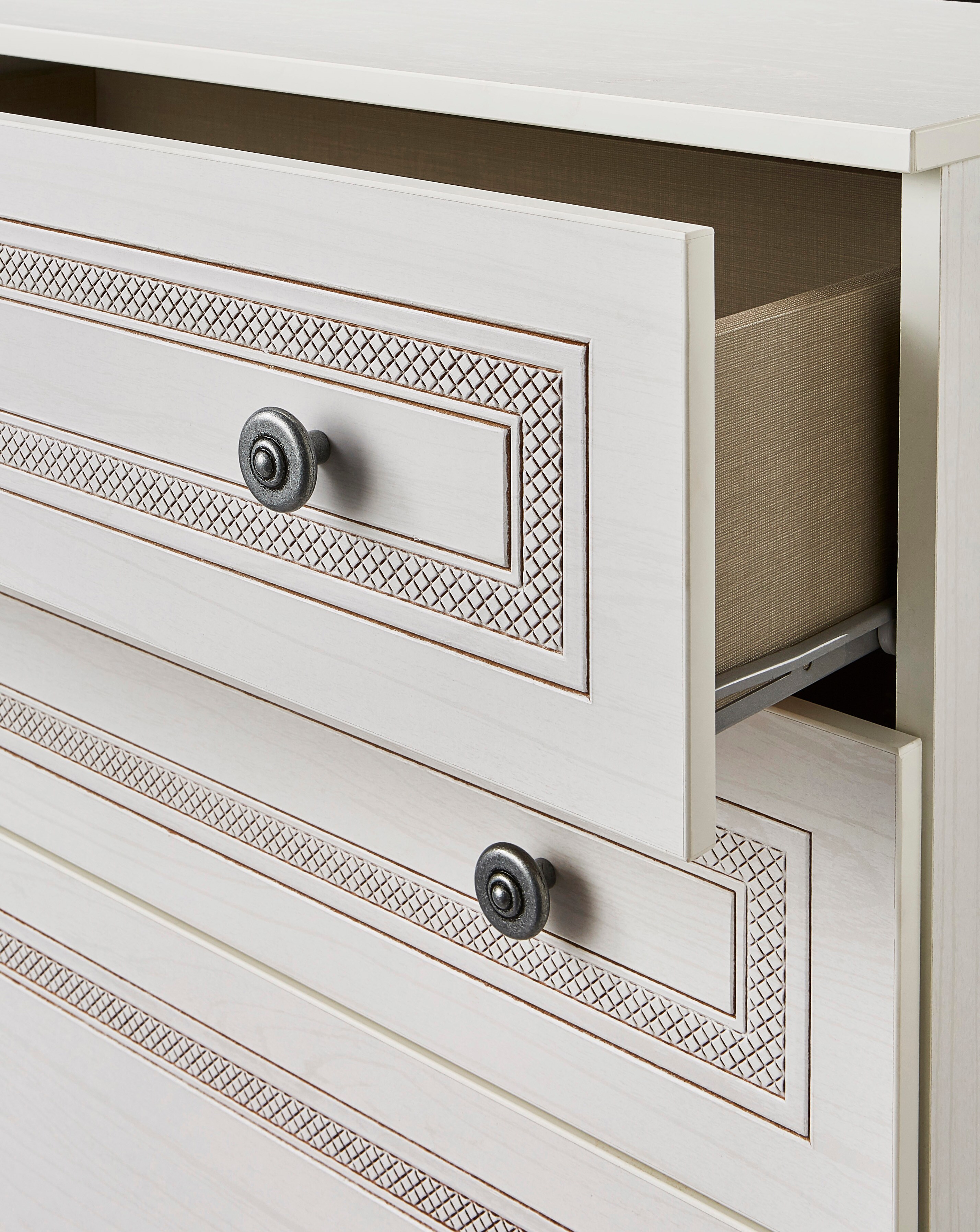 Richmond is a stylish ready assembled bedroom furniture range. Featuring four Drawers which have a very distinctive embossed drawer design, with quality pewter metal handles, lined drawers and metal drawer runners. All surfaces are fully scratch resistant and can be easily wiped clean. Made in the UK. Ready assembled. Please note: we are unable to deliver to Ireland, Scottish Islands, Isle of Wight and Isle of Man.