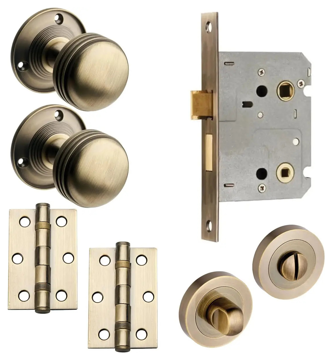 Ringed Antique Brass Mortice Bathroom Door Knob - 76mm - Rather than needing to buy all the different components to upscale your bathroom door separately, this cost-effective door pack gives you them all in one convenient product. Inside, you get two stunning beehive doorknobs, 2 x hinges, thumbturns, a mortice lock and the necessary fixings.