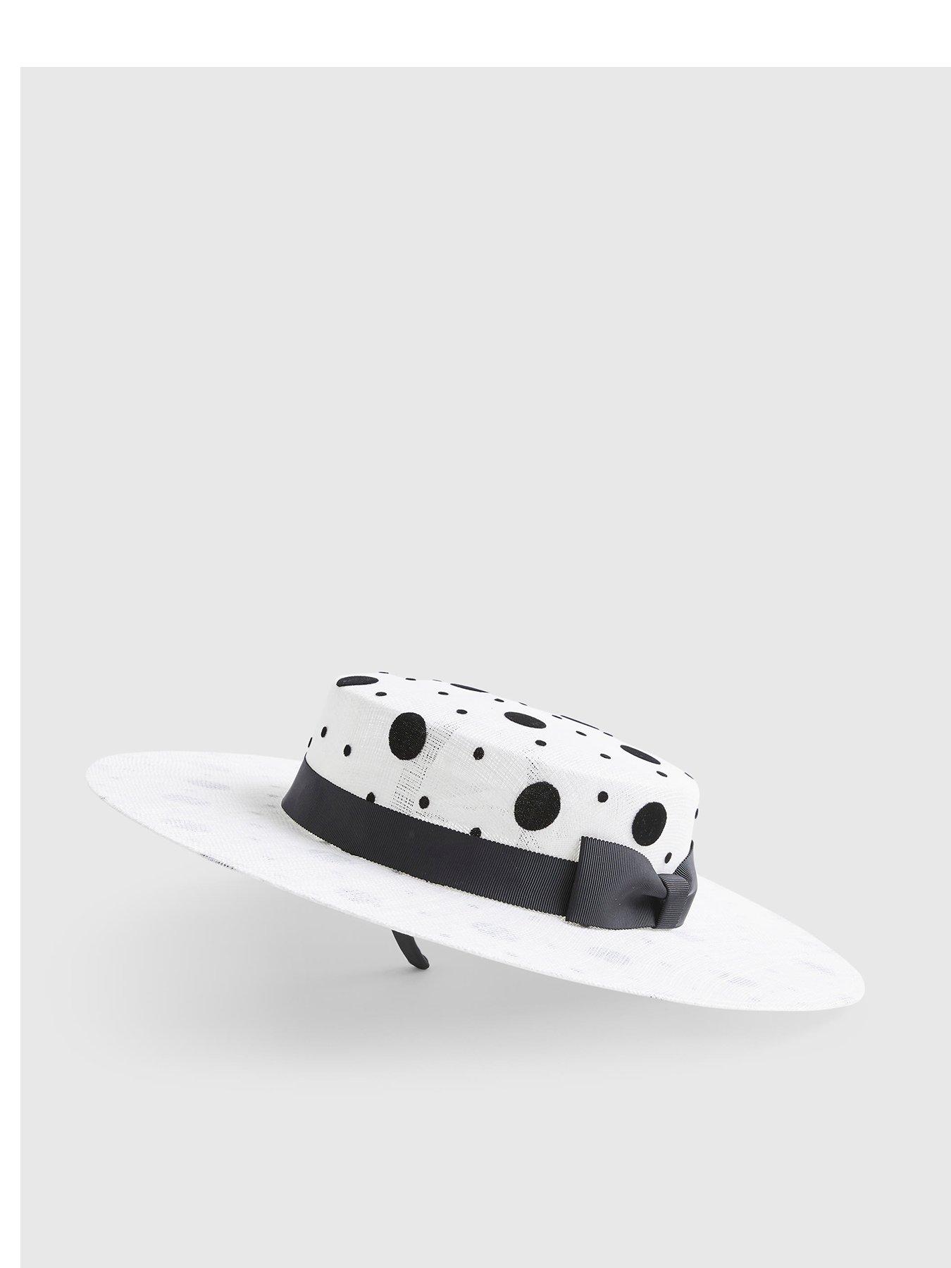 River Island Premium Sasha Polka Dot Boater Hat Edwina Ibbotson collection,Polka dot,Headband,Ribbon band,Length: 39.5cm,Width: 37.5cm,Depth: 8cm Edwina Ibbotson collection Material Content: 100% Sinamay Polka dot Headband Ribbon band Length: 39.5cm Width: 37.5cm Depth: 8cm