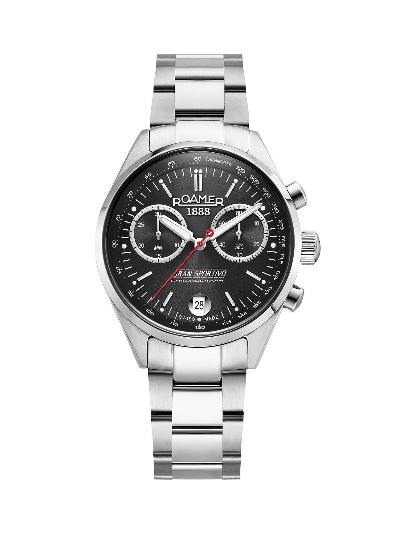 Roamer Swiss Made Gran Sportivo Boxed Set. Black Dial Chronograph Set In A Stainless Steel Case And Bracelet, With Additional Black Leather Strap Roamer Introduces The Gran Sportivo, A Sophisticated Timepiece Designed To Elevate Your Style. With Its Sleek 41Mm Stainless Steel Case Boasting A 10 Atm Water Resistance, This Chronograph Watch Is Built To Withstand The Rigors Of Everyday Life. Featuring Anti-Reflection Sapphire Glass And Ion-Plated Finishing, The Gran Sportivo Ensures Both Durability And Impeccable Clarity. Powered By A Swiss-Made Ronda 250 Movement, The Gran Sportivo Delivers Precise Timekeeping With Two Sub-Dials And Two Hands, Accompanied By A Convenient Date Display At 6 O'Clock. Embrace The Fusion Of Style And Functionality With The Roamer Gran Sportivo Collection. Whether You'Re Navigating Your Daily Schedule Or Making A Statement At A Special Event, This Timepiece Is The Perfect Companion. With Its Swiss Craftsmanship And Attention To Detail, The Gran Sportivo Embodies The Essence Of Luxury And Precision, Ensuring You Stand Out From The Crowd With Effortless Elegance. This Stunning Watch Gives You The Choice Of Wearing It With A Oyster Style Stainless Steel Bracelet Or A Stitched Leather Strap. This Particular Model Has A Black Croco Embossed Leather Strap To Match The Crisp Black Sunray Dial Adding A Touch Of Rugged Sophistication To Your Look. The Gran Sportivo Comes With An Elegant, Limited Edition, Interchangeable Box And The Extra Leather Strap Uses An Easy Change Push-Pin System. 24Hr Display: N Accessory List: Additional Leather Strap Age Range: 8+ Case Diameter (In Cm): 4.1 Case Shape: Round Fastening Type: Bracelet Glass: Sapphire Movement: Swiss Quartz (Battery) Strap Material: Stainless Steel Water Resistant: Y Swiss Made 7Yr Warranty Boxed Set With Additional Blue Leather Strap Chronograph Feature Date Feature Presentation Box Sapphire Crystal 100M Water Resistant