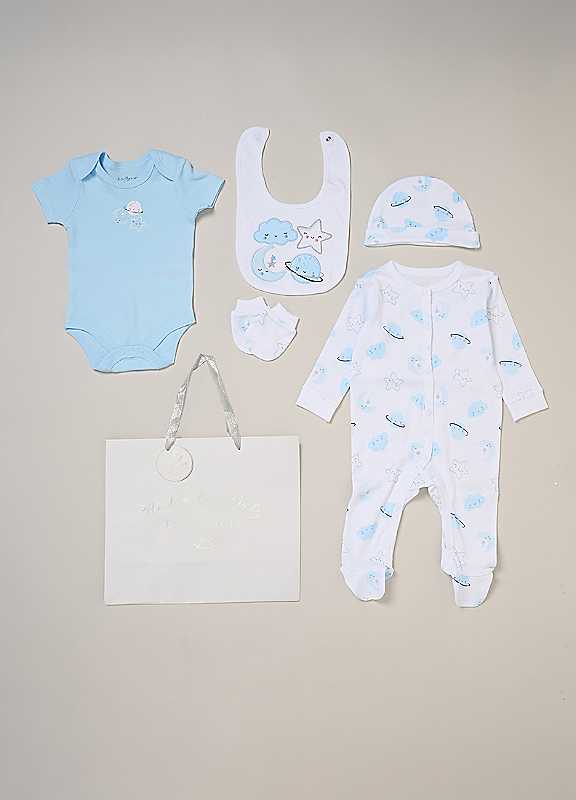 Surprise new parents with the printed 5-piece baby gift set from Rock a Bye Baby boutique. This thoughtful bundle includes a cosy matching all-in-one, bodysuit, bib, hat, and mitts for essential wardrobe pieces. Crafted from 100% cotton, each item ensures their baby stays stylish and snug, perfect for everyday wear or special occasions. Packaged elegantly in a mesh bag.Machine washableRefer to care label instructions100% Cotton