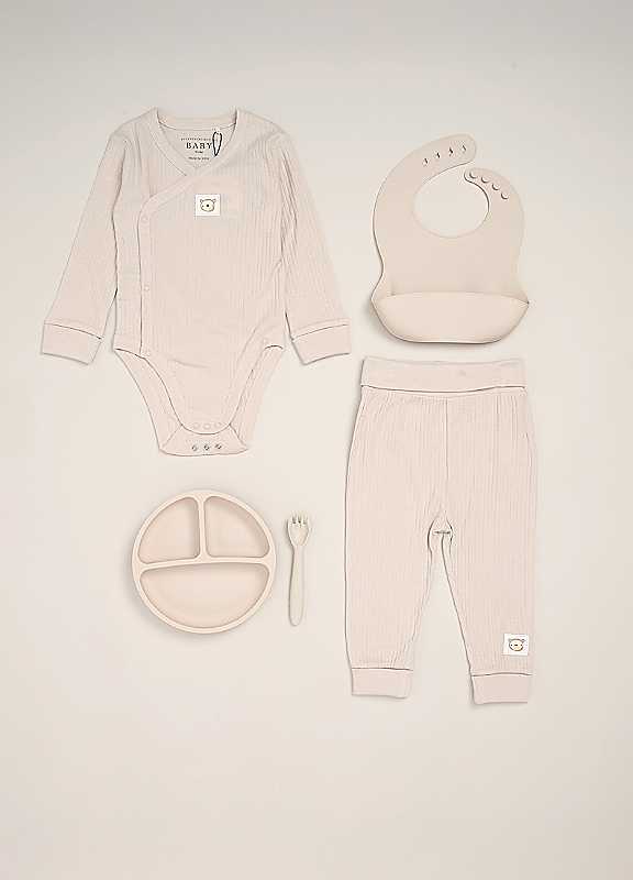 Practical and playful, this five-piece gift set from Rock a Bye Baby boutique includes a soft cotton ribbed bodysuit and leggings, plus a silicone bib, bowl and spork for mealtime moments. Perfect for little ones starting solids, its a thoughtful set designed for everyday comfort and feeding time ease.Machine washableRefer to care label instructions100% Cotton
