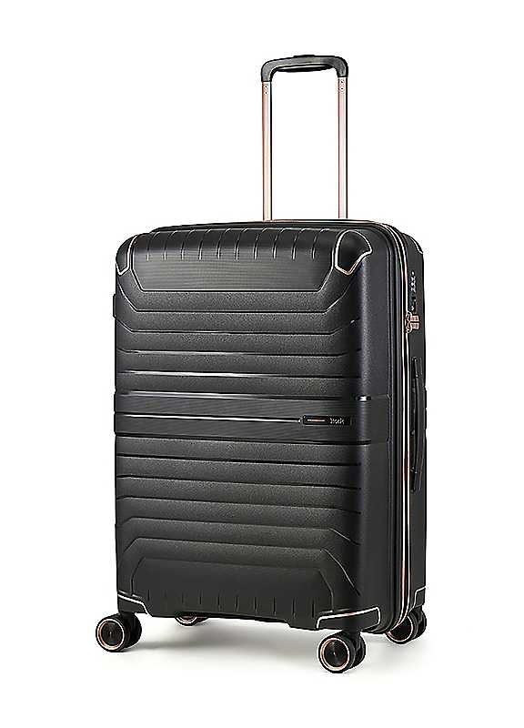 Proudly presenting Astrid, to take your travel to a new dimension. Astrid is a stylish, contemporary design, with striking reinforced corner protectors that are beautifully accented in rose gold. Produced in a robust PP material, Astrid is an eye-catching addition to your travel agenda, designed with geometric lines that distinguish the design of the case for real standout. Produced in a classically refined palette with rose gold accents, Astrid is ideal for the traveller seeking an elevated packing partner with a difference. Astrid makes the case for refined adventure, incorporating expander sections for every eventuality. With the quality finish you'd expect from Rock, Astrid travels with confidence, incorporating a reassuring TSA lock, telescopic, push-button handle and easy rolling double wheels make every journey a dream. Built to last, all Rock suitcases come with a 15-year manufacturer's warranty against manufacturing defects arising from faulty workmanship or materials.Weight approx. 3.7kgCapacity: 61/69 litre (When using expander option)Dimensions approx. 65 x 46 x 27/30 cm