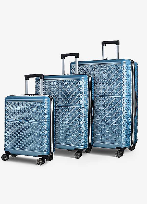 Designed to see and be seen, Maya embodies the Rock spirit of stylish escape. An unmissable signature design, Maya's iced toned palette is perfect for the fashionable traveller seeking city escapes and party potential. Created as a wide-body, hard case to meet the needs of a multi-look traveller. Expandable - leave your packing worries behind with Maya's expander zip which can be opened to increase the volume of the case, providing valuable additional packing capacity for any last-minute extras or new purchases you may need to squeeze in. Tough & Practical - 8 smooth rolling wheels and a telescopic, push-button handle will help you glide effortlessly on your travels. TSA combination lock - For your complete peace of mind, Selene cases are fitted with a TSA combination lock. Built to last - all Rock products come with a 15 year manufacturer's warranty against manufacturing defects arising from faulty workmanship or materials. The 3 cases can be nested inside one another to save space when not in use.Small capacity: 35/42 (when using expander option) litreMedium weight: 4.2kgMedium capacity: 75/86 (when using expander option) litreLarge weight: 5.2kgLarge capacity: 118/133 (when using expander option) litreMaterial: PolypropyleneSmall dimensions approx. 55 x 40 x 20/24cmMedium dimensions approx. 70 x 50 x 27/31cmLarge dimensions approx. 80 x 55 x 33/37cm