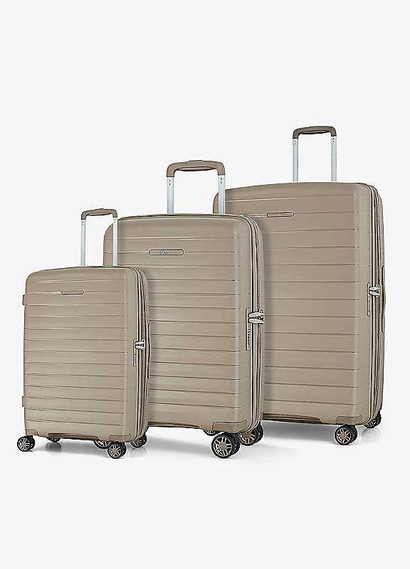 Rock Palma embodies the quiet luxury trend, is a celebration of elegance and minimalism, and is as chic as the city from which it gets its name. With clean lines and a refined palette Palma is the perfect companion for short escapes or long-haul adventures. Expandable - leave your packing worries behind with Palma's expander zip which can be opened to increase the volume of the case, providing valuable additional packing capacity for any last-minute extras or new purchases you may need to squeeze in (Large and Medium only). Tough & Practical - 8 smooth rolling wheels and a telescopic, push-button handle will help you glide effortlessly on your travels. TSA combination lock - For your complete peace of mind, Palma cases are fitted with a TSA combination lock. Built to last - all Rock products come with a 15 year manufacturer's warranty against manufacturing defects arising from faulty workmanship or materials. The 3 cases can be nested inside one another to save space when not in use.Small weight: 2.65kg32 litre capacityMedium weight: 3.7kgMedium capacity: 65/75 (when using expander option) litreLarge weight: 4.6kgCapacity: 102/116 (when using expander option) litre Material: PolypropyleneSmall dimensions approx. 55 x 36 x 20cmMedium dimensions approx. 68 x 43.5 x 26/30cmLarge dimensions approx. 78 x 50.5 x 31/35cm