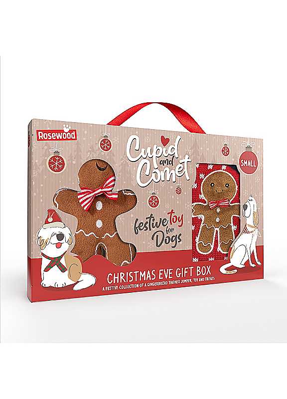 Make this Christmas Eve a memorable one for your four-legged family member with our Gingerbread Novelty Christmas Eve Gift Pack. Whether you're unwrapping presents, sipping hot cocoa, or sharing holiday cheer with loved ones, your dog will be a part of the festivities in style. This gift pack is a wonderful way to celebrate the holiday season together and show your furry friend just how much they mean to you. Get ready for a season of warmth, joy, and tail-wagging happiness! Included in this Christmas eve gift pack is a festive knit novelty dog jumper, a plush gingerbread squeaky dog toy and a 40g pack of real meat chicken (gingerbread shape) dog treats. Brand: Rosewood Jumper: 100% Acrylic Treats: 50% Chicken, Soy Protein, 10% Rice, Tapioca Starch, Glycerin, 5% Carrot, Sorbitol Additives: Preservatives-Potassium Sorbate For ingredients information click here
