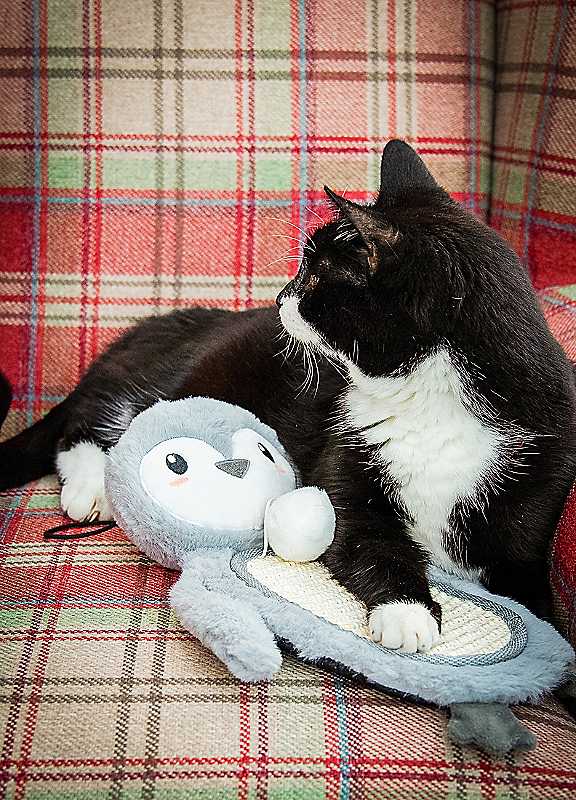 Adorable penguin plush toy with a scratcher pad tummy and catnip ball. Hang on your door or lie on the floor with the hanger and non-slip base! Perfect size for play or cuddle-time.Size approx. 20 x 35 cm